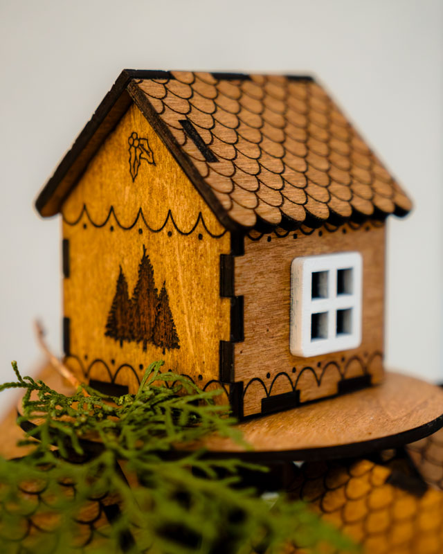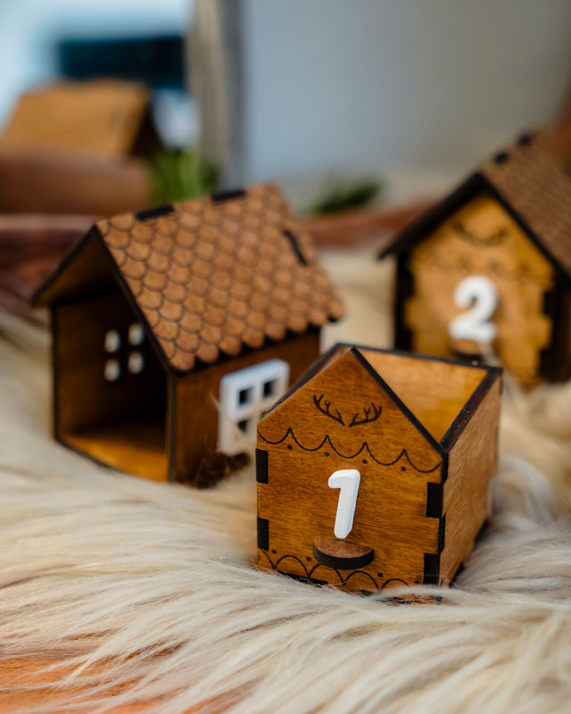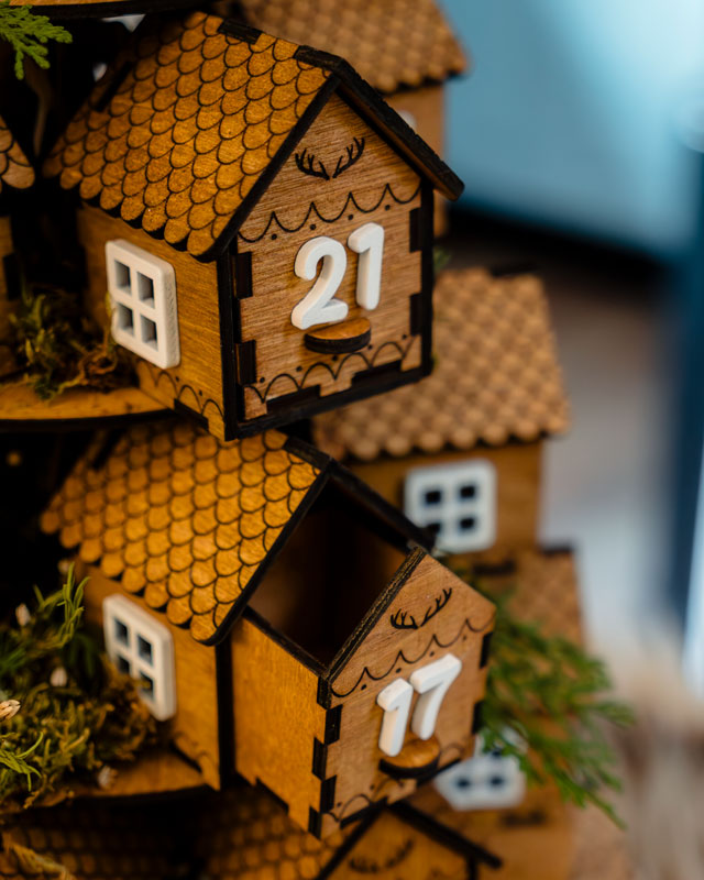 El conjunto está compuesto por un soporte cónico de 5 pisos sobre el que se distribuyen 25 casitas de madera, que funcionan como pequeños cajones donde guardar regalos, mensajes o sorpresas diarias. Cada casita ha sido tintada a mano por nosotros mismos, lo que aporta ese acabado natural, cálido y ligeramente rústico que hace que ninguna pieza sea igual a otra.
